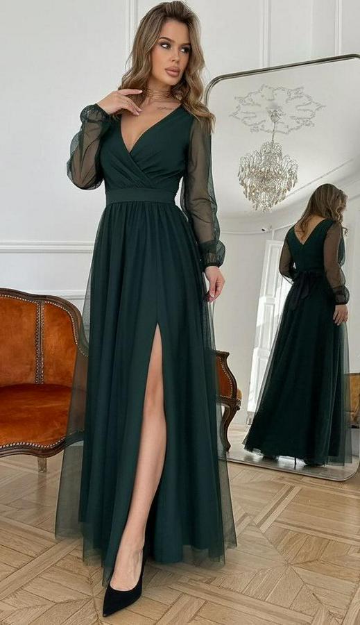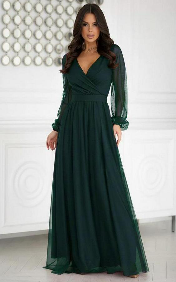 AnasayfaTüm ÜrünlerElbiseUzun Kollu Kruvaze Yakalı Belden Kuşaklı Tüllü Uzun Ithal Krep Elbise
