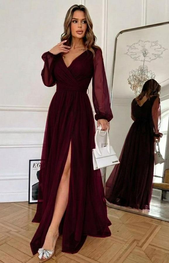 AnasayfaTüm ÜrünlerElbiseUzun Kollu Kruvaze Yakalı Belden Kuşaklı Tüllü Uzun Ithal Krep Elbise