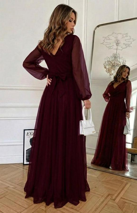 Uzun Kollu Kruvaze Yakalı Belden Kuşaklı Tüllü Uzun Ithal Krep Elbise