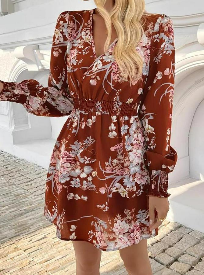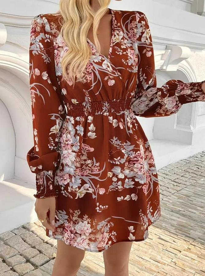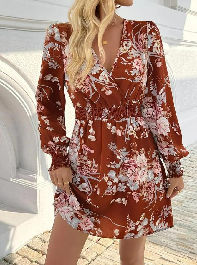 Uzun Kollu Kruvaze Yakalı Çiçek Desenli Mini Süprem Elbise