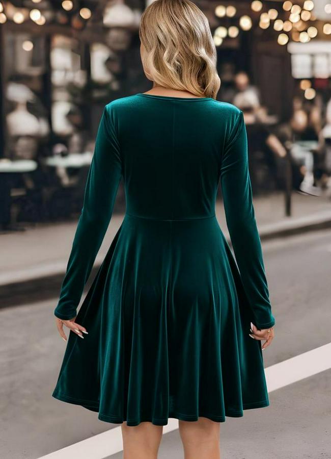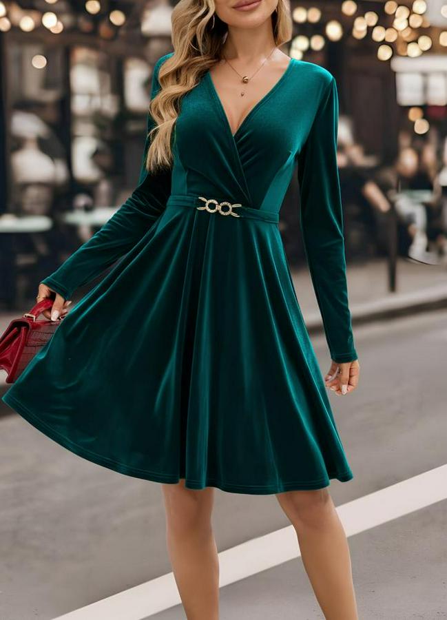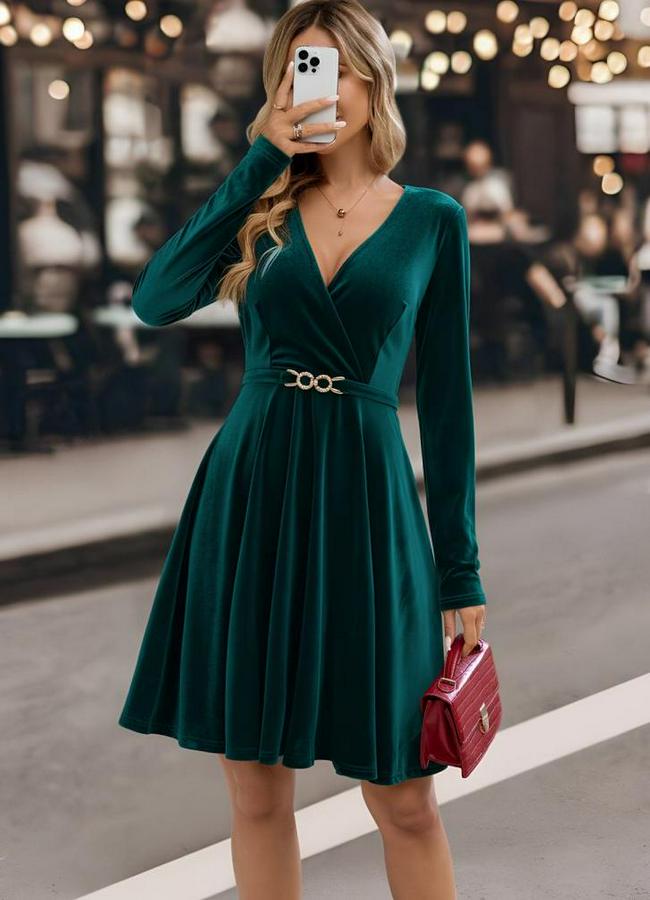 Uzun Kollu Kruvaze Yakalı Toka Detaylı Mini Kadife Elbise
