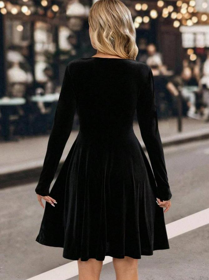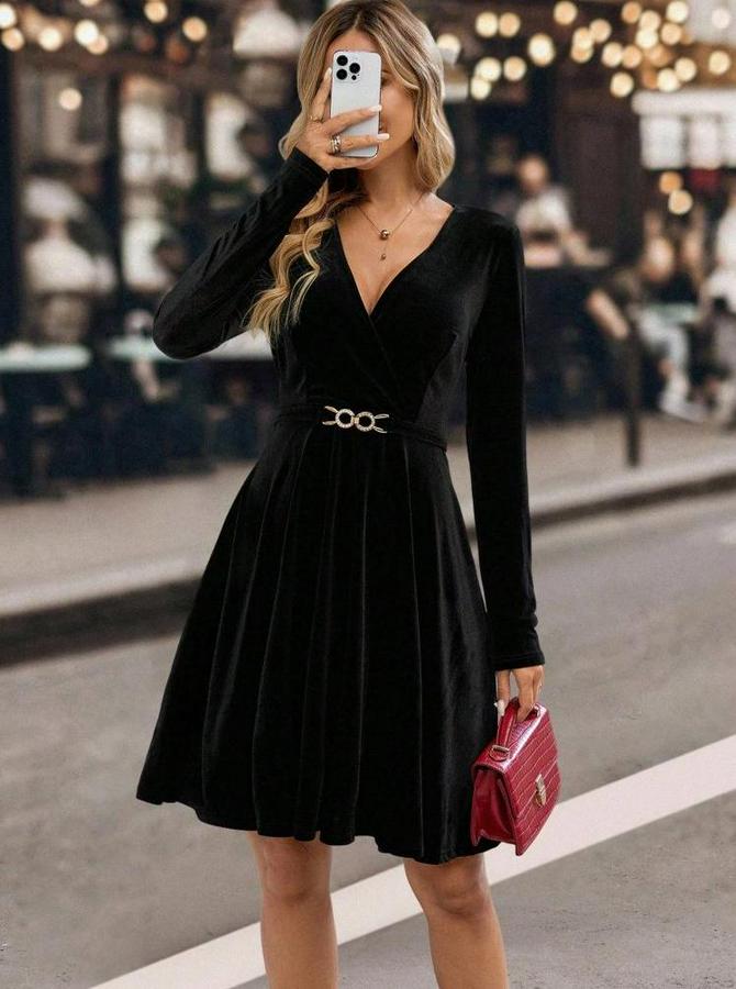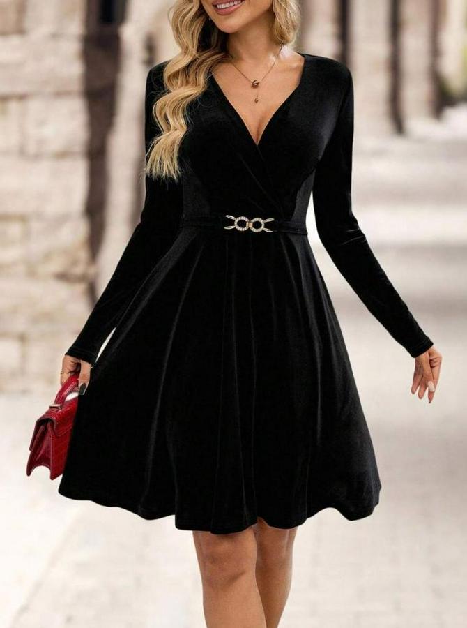 Uzun Kollu Kruvaze Yakalı Toka Detaylı Mini Kadife Elbise