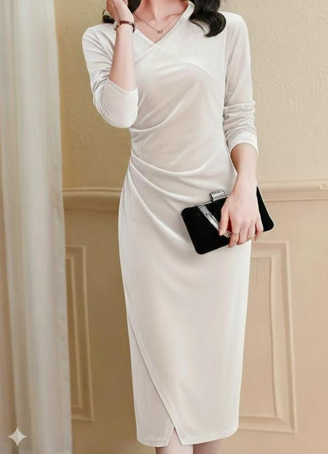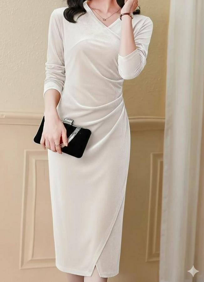 AnasayfaTüm ÜrünlerElbiseUzun Kollu Kruvaze Yakalı Yandan Büzgülü Önden Çapraz Detaylı Midi Kadife Elbise