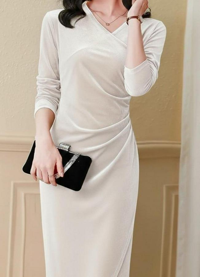Uzun Kollu Kruvaze Yakalı Yandan Büzgülü Önden Çapraz Detaylı Midi Kadife Elbise