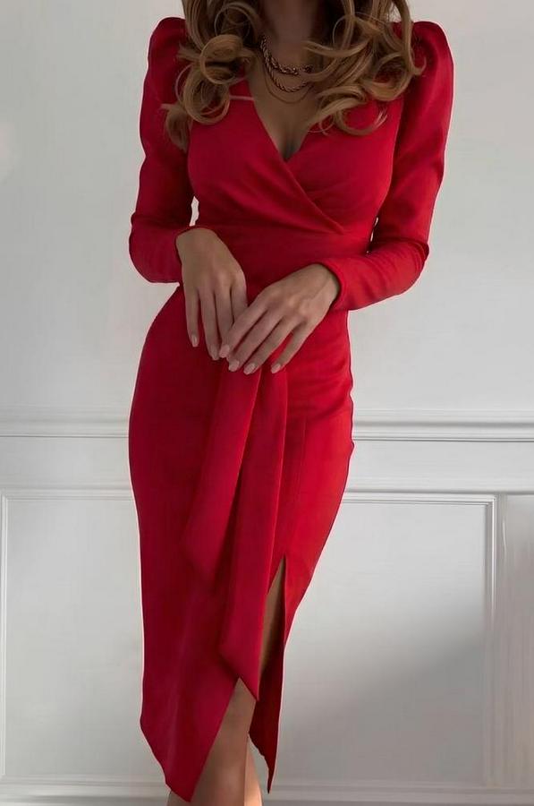 Uzun Kollu Kruvaze Yakalı Yandan Yırtmaçlı Belden Kuşaklı Midi Ithal Krep Elbise