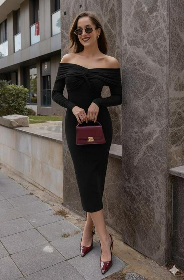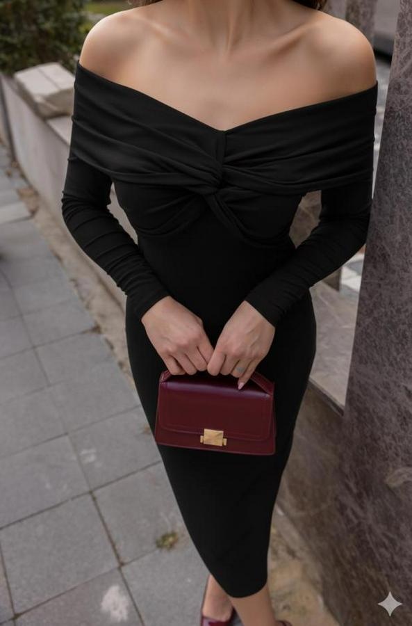 AnasayfaTüm ÜrünlerElbiseUzun Kollu Madonna Yaka Düğüm Büzgü Detay Maxi Boy Elblbise