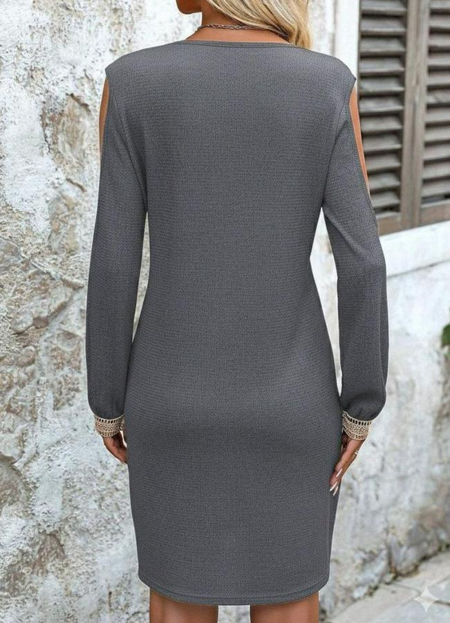Uzun Kollu Omuzdan Açık V Dantel Yakalı Mini Waffle Elbise