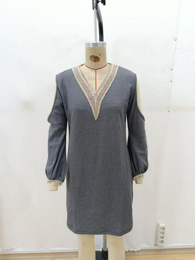 AnasayfaTüm ÜrünlerElbiseUzun Kollu Omuzdan Açık V Dantel Yakalı Mini Waffle Elbise