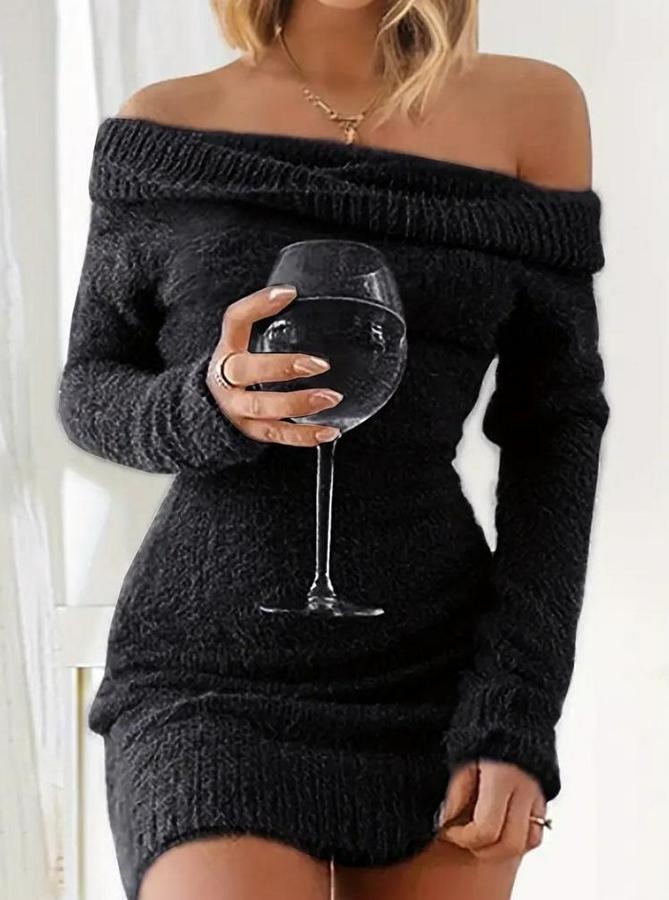 Kadın Uzun Kollu Omuzlardan Açık Kısa şardonlu Triko Elbise