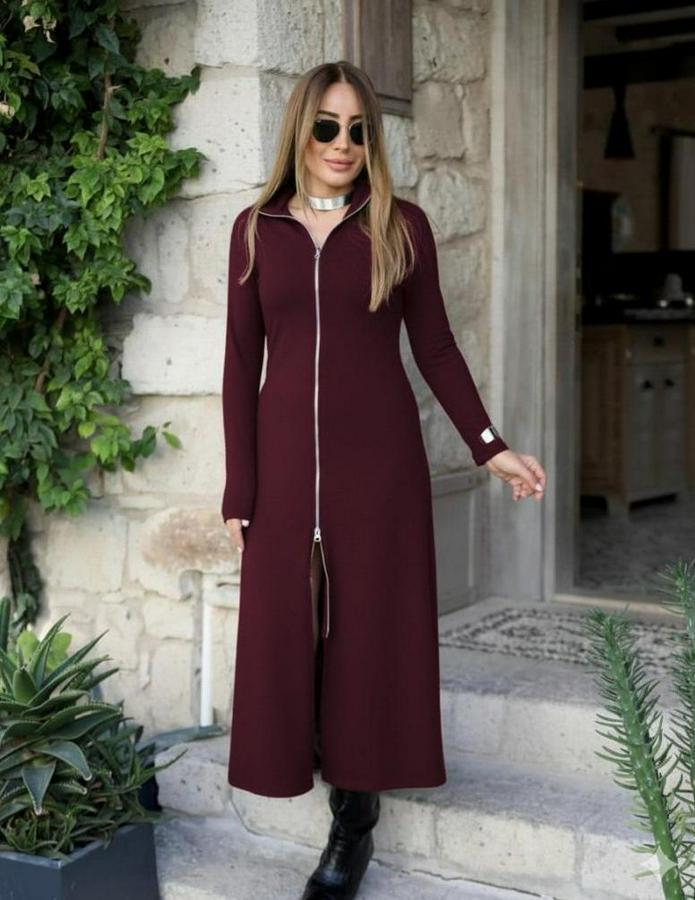 AnasayfaTüm ÜrünlerElbiseUzun Kollu Önden Fermuarlı Maxi Viskon Iki Iplik Elbise