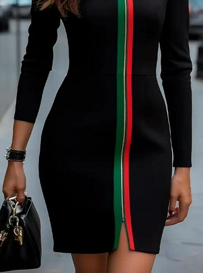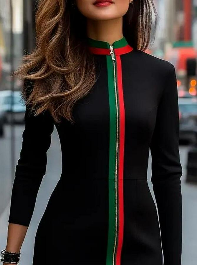 Kadın Uzun Kollu önden Tam Boy Fermuarlı Renkli şerit Detaylı Viskon Iki Iplik Mini Elbise