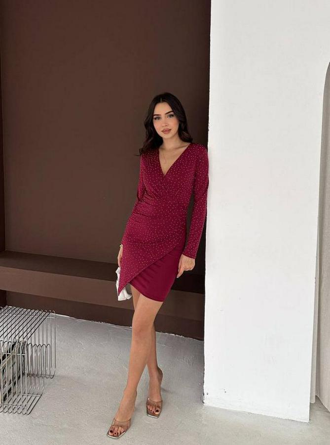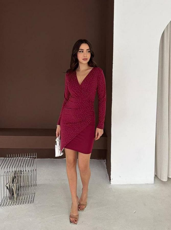 AnasayfaTüm ÜrünlerElbiseUzun Kollu Taş Detay Mini Kruvaze Elbise