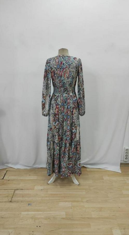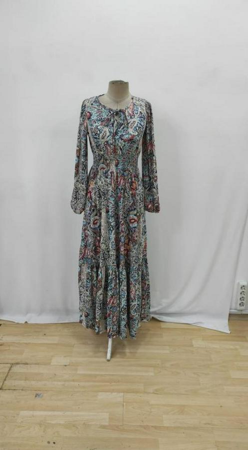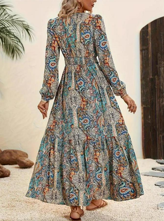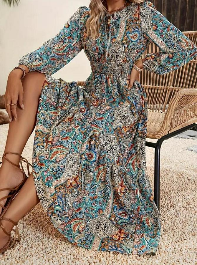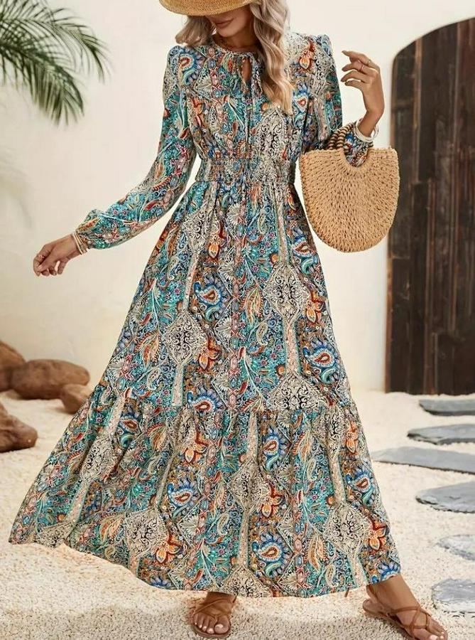 AnasayfaTüm ÜrünlerElbiseUzun Kollu Uakadabağcıklı Beli Lastikli Desenli Uzun Süprem Elbise
