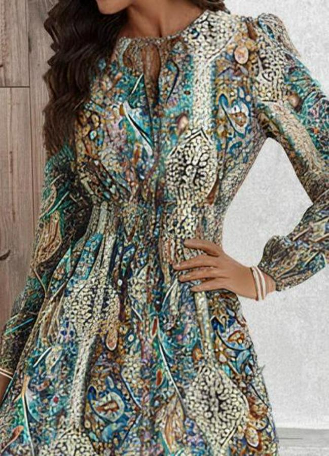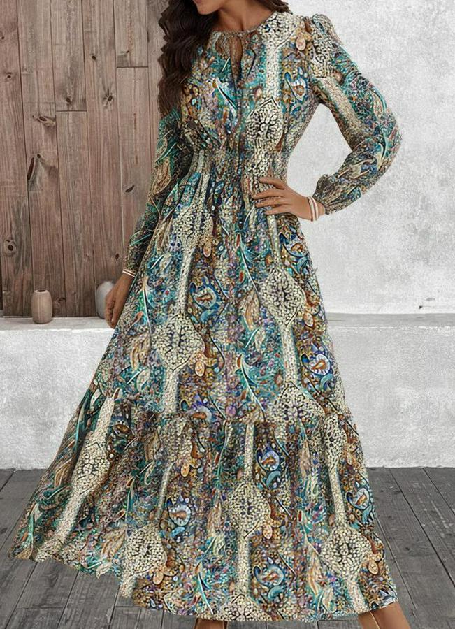 AnasayfaTüm ÜrünlerElbiseUzun Kollu Uakadabağcıklı Beli Lastikli Desenli Uzun Süprem Elbise