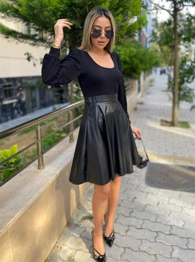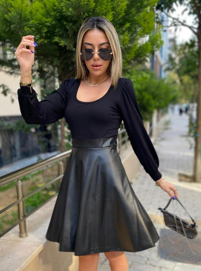 AnasayfaTüm ÜrünlerElbiseUzun Kollu Üst Viskon Alt Kloş Deri Elbise