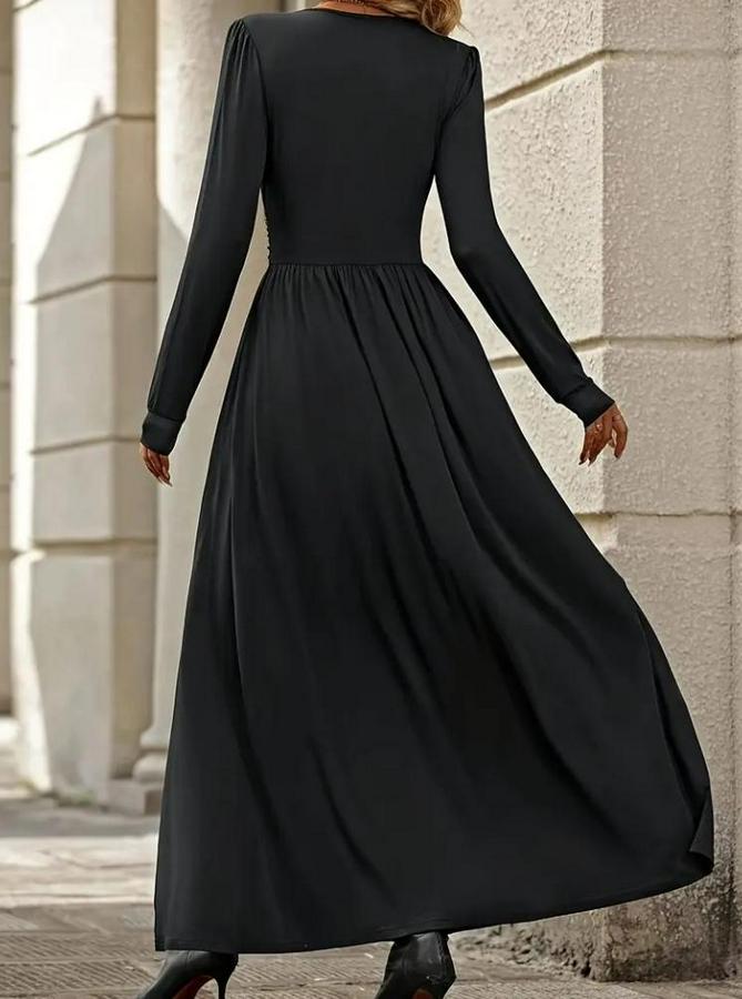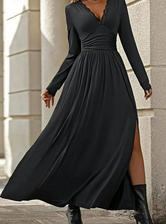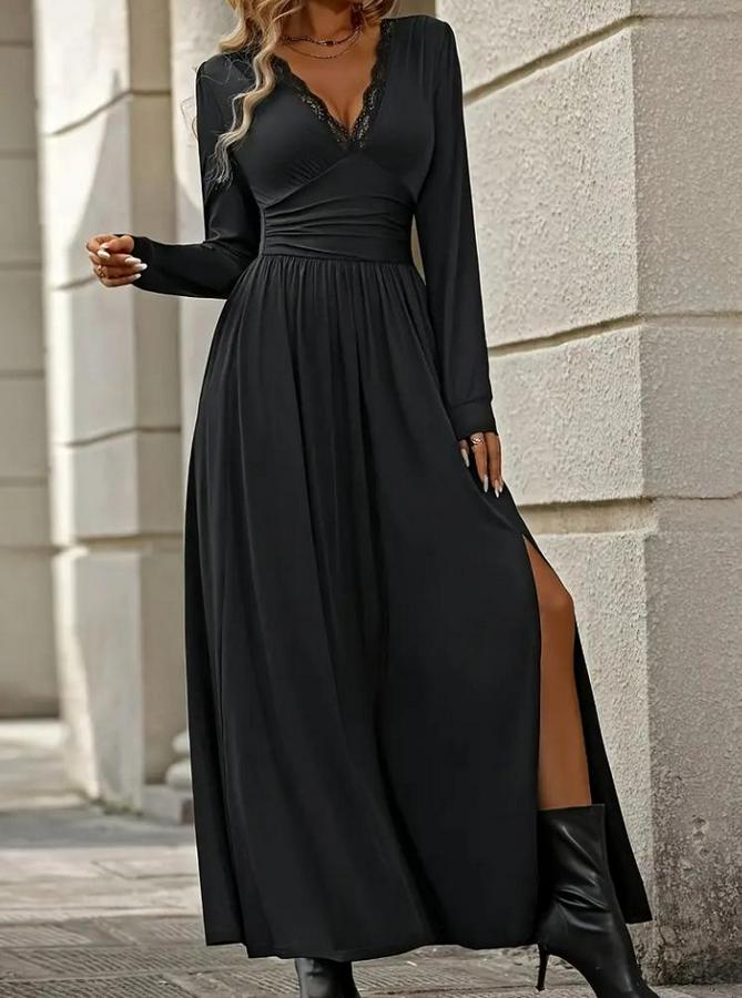 AnasayfaTüm ÜrünlerElbiseUzun Kollu V Dantel Yakalı Yırtmaçlı Uzun Sandy Elbise