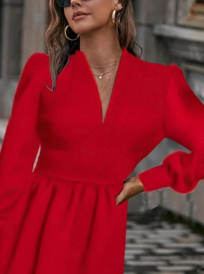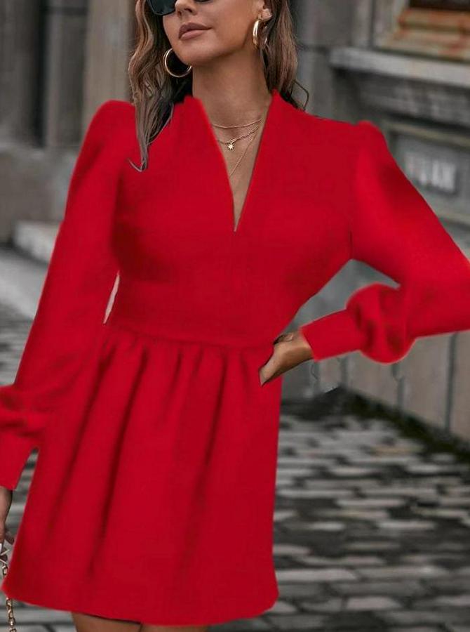 Kadın Uzun Kollu V Yaka Belden Hafif Pileli Scuba Krep Mini Boy Elbise