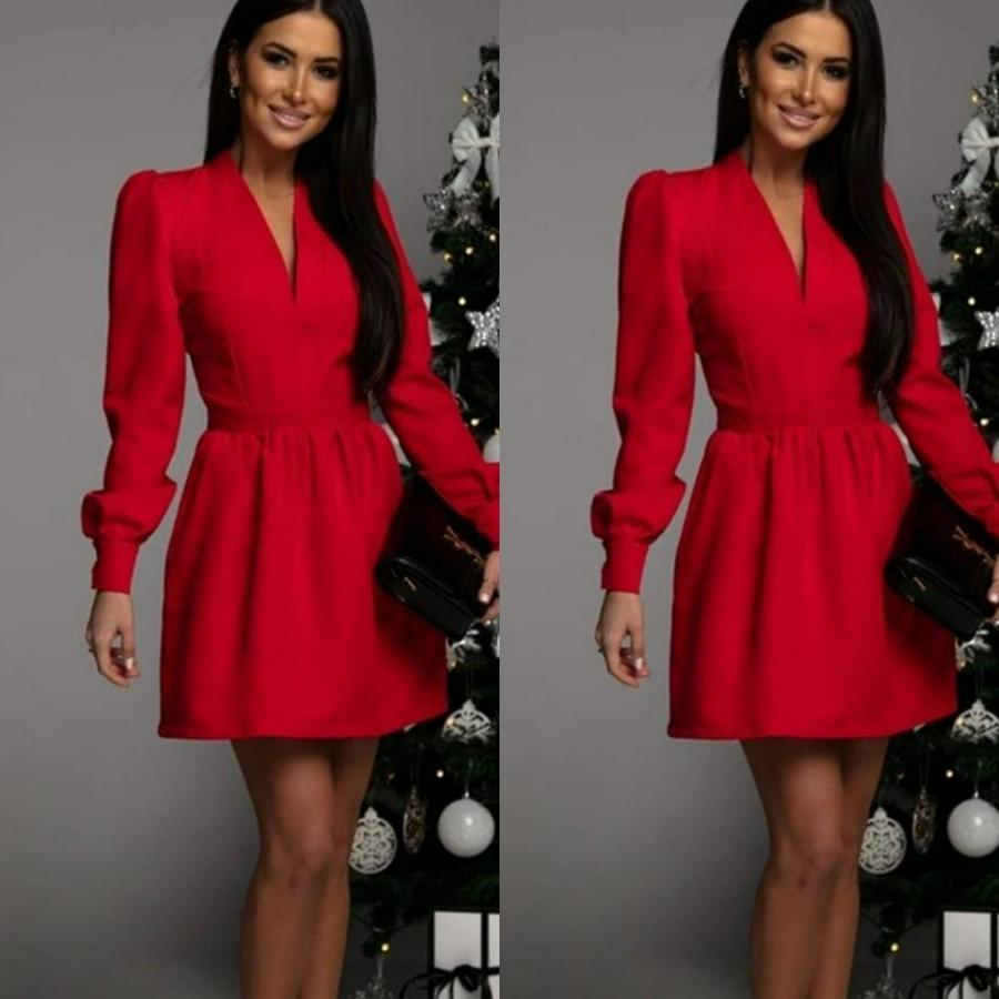 Kadın Uzun Kollu V Yaka Belden Hafif Pileli Scuba Krep Mini Boy Elbise