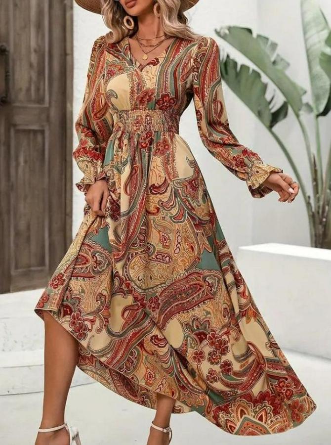 AnasayfaTüm ÜrünlerElbiseUzun Kollu V Yakalı Beli Lastikli Desenli Süprem Elbise