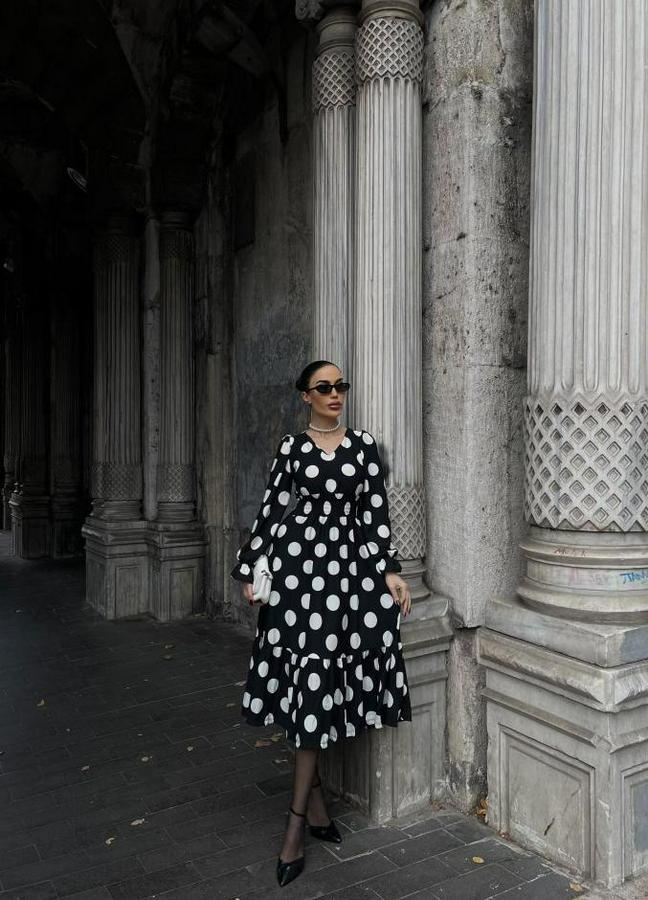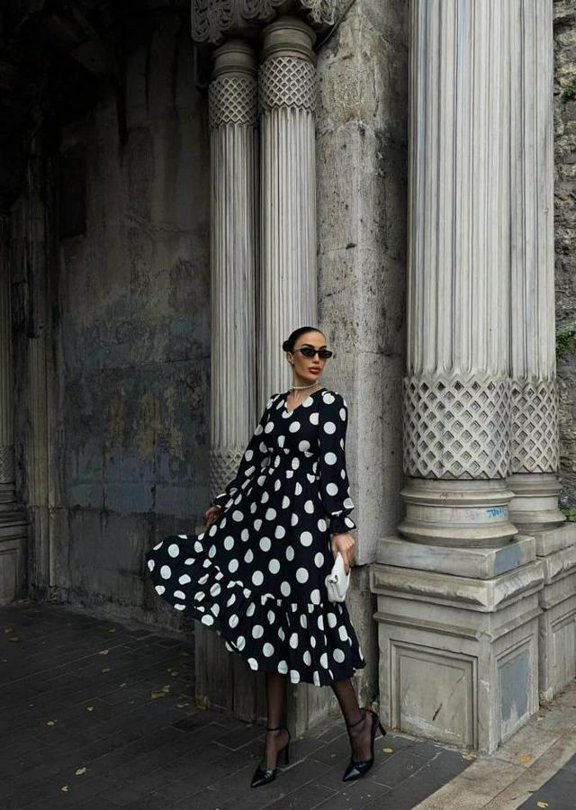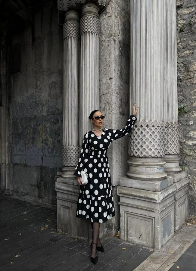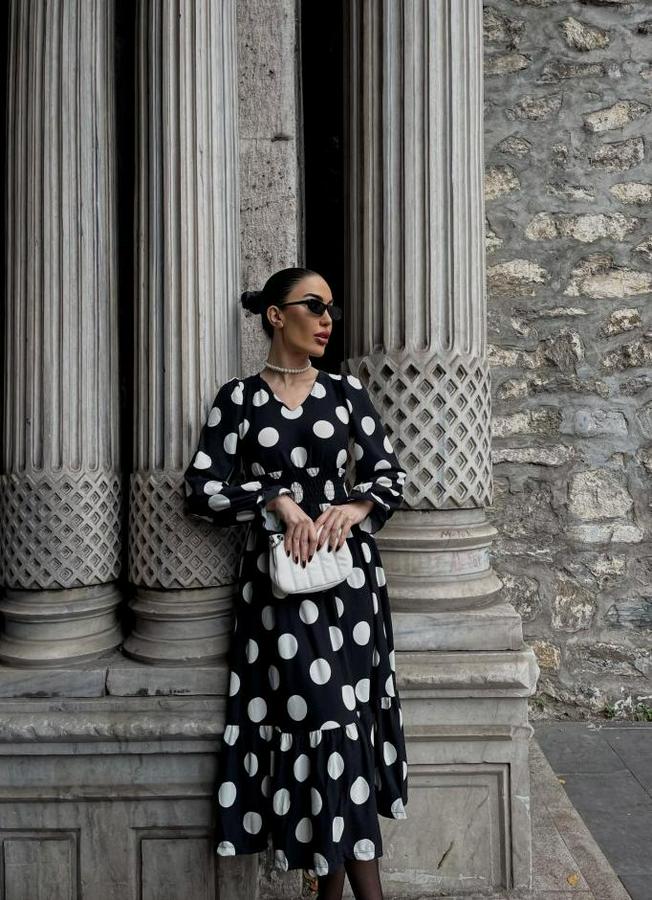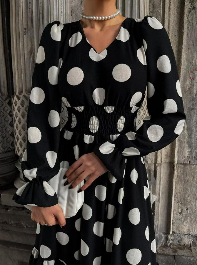 AnasayfaTüm ÜrünlerElbiseUzun Kollu V Yakalı Beli Lastikli Puantiyeli Uzun Krep Elbise