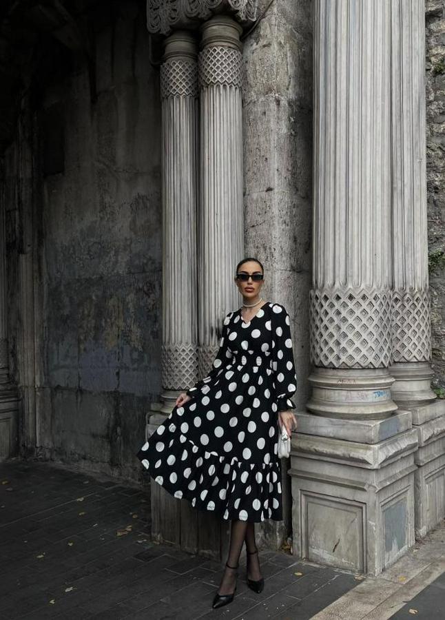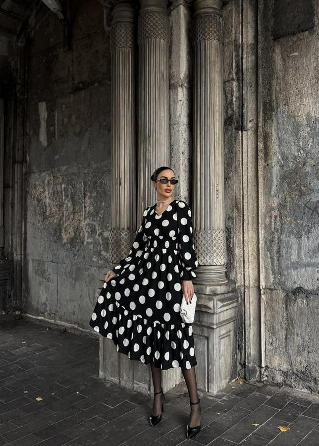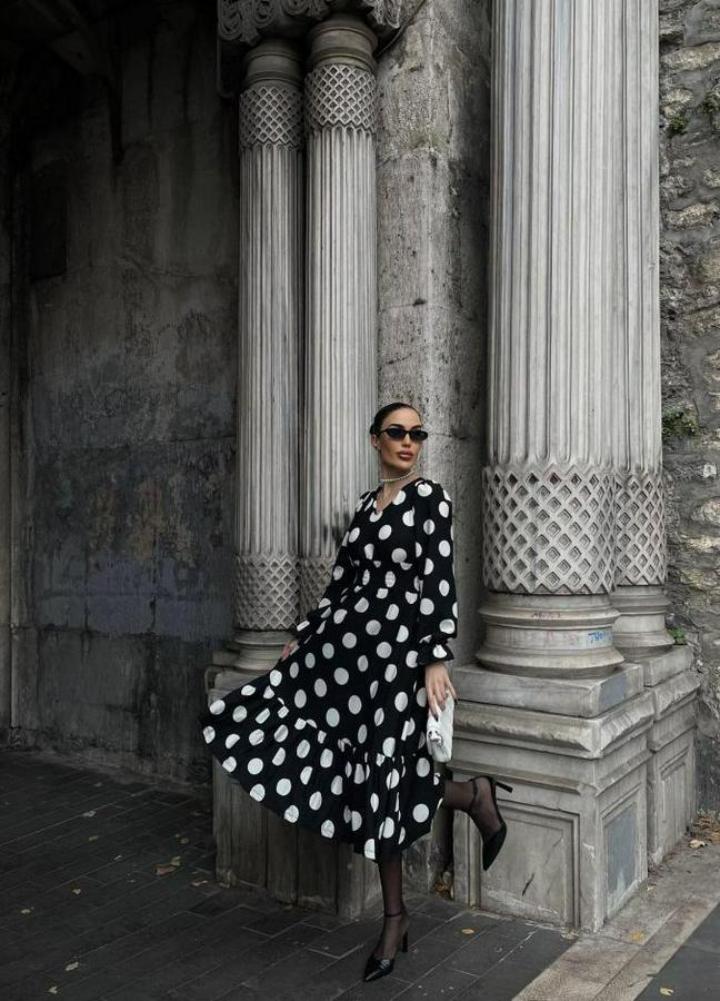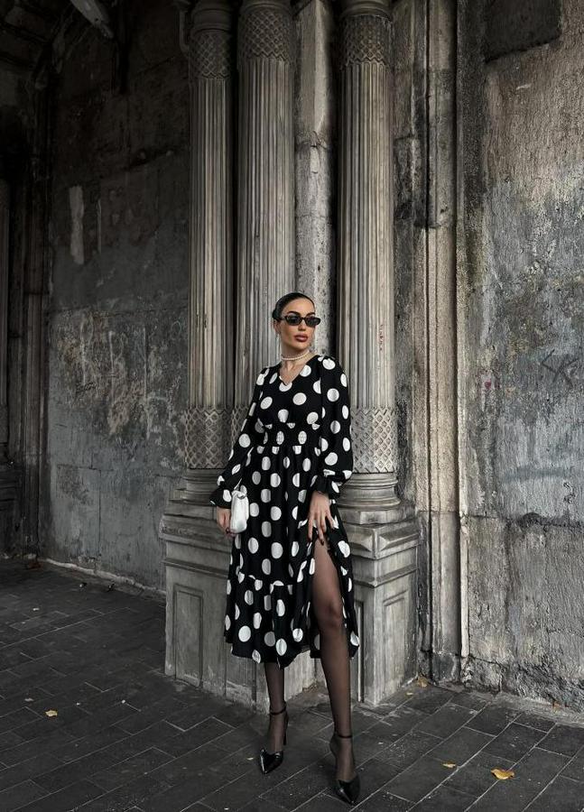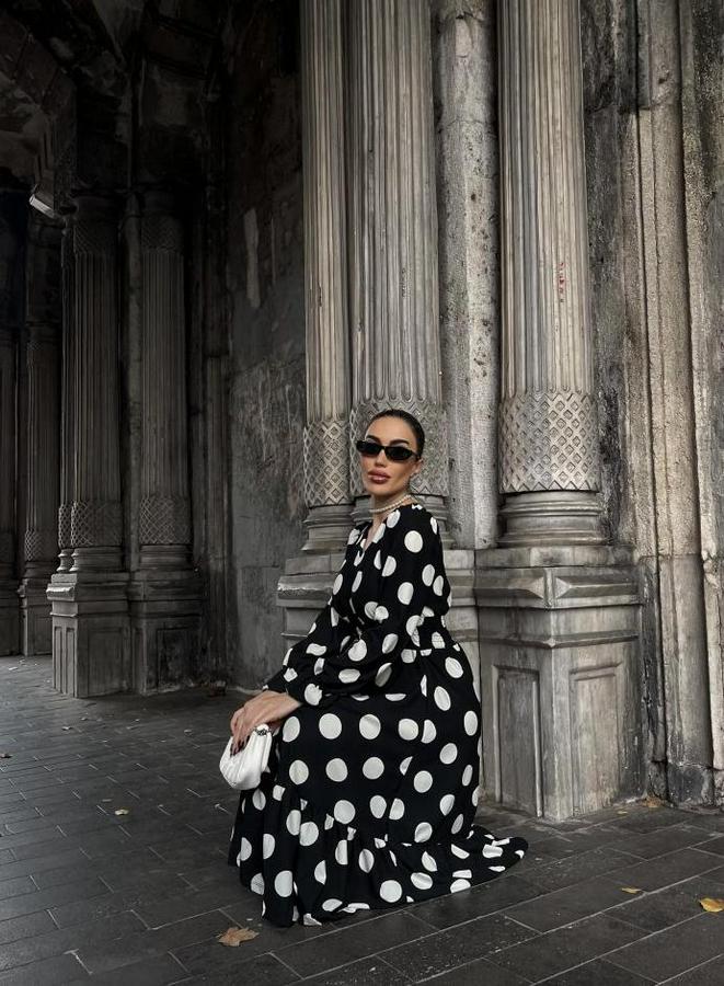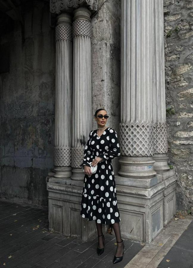 AnasayfaTüm ÜrünlerElbiseUzun Kollu V Yakalı Beli Lastikli Puantiyeli Uzun Krep Elbise