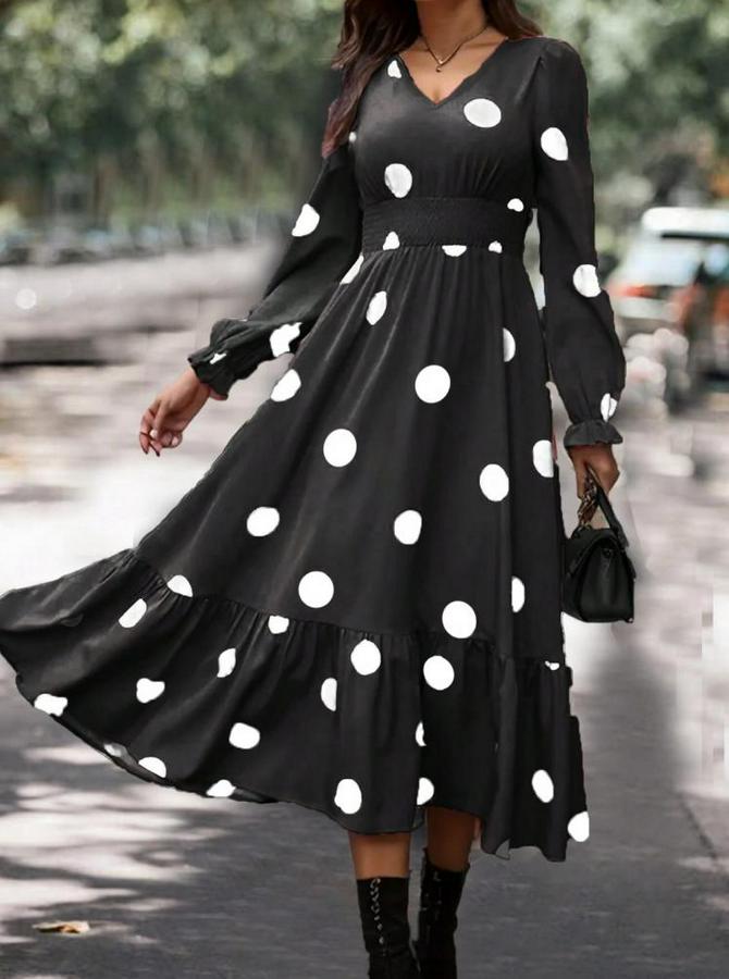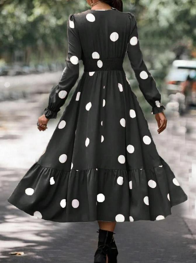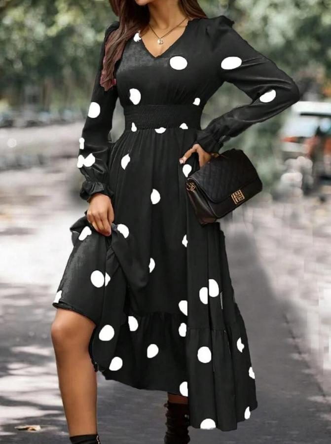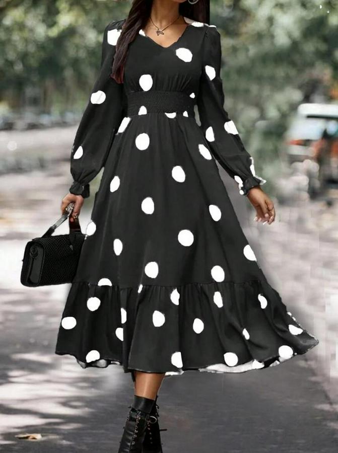 AnasayfaTüm ÜrünlerElbiseUzun Kollu V Yakalı Beli Lastikli Puantiyeli Uzun Krep Elbise
