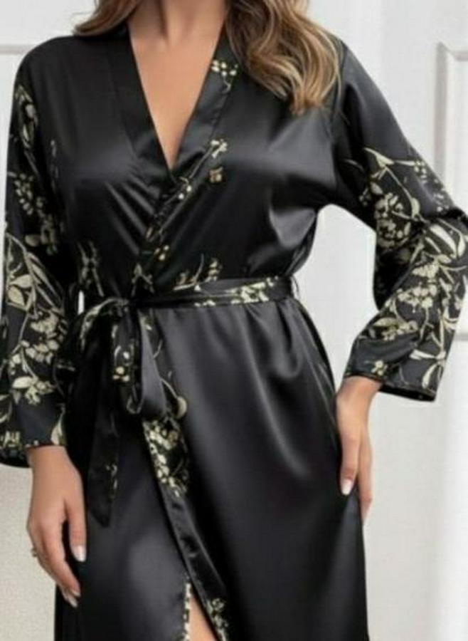 Uzun Kollu V Yakalı Çiçek Baskılı Belden Kuşaklı Midi Saten Gecelik