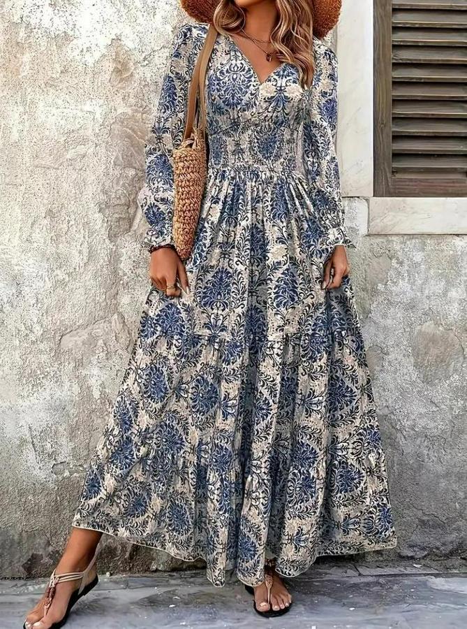 AnasayfaTüm ÜrünlerElbiseUzun Kollu V Yakalı Desenli Süprem Elbise