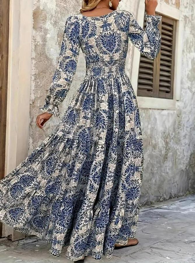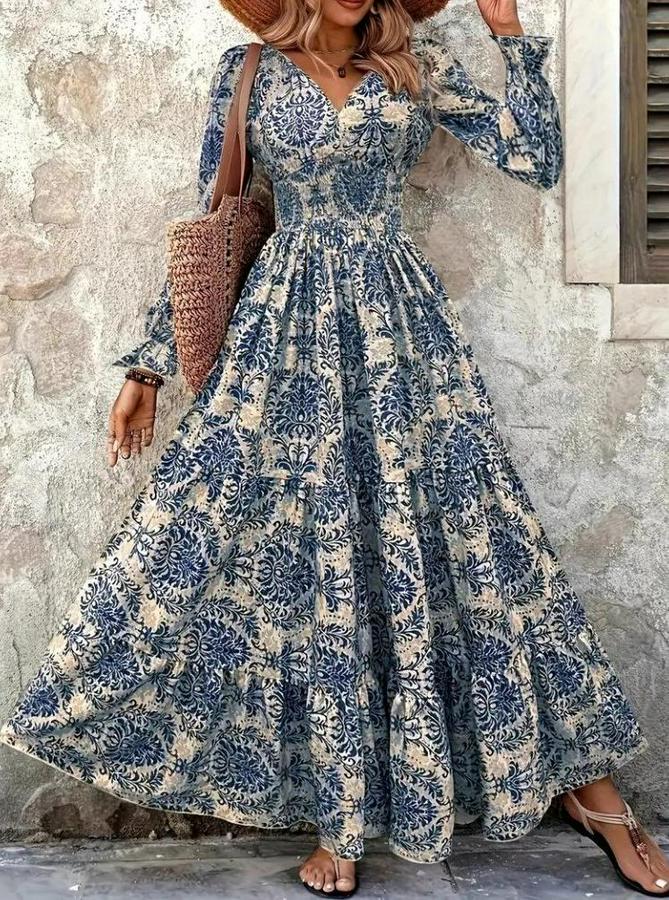 Kadın Uzun Kollu V Yakalı Desenli Süprem Elbise
