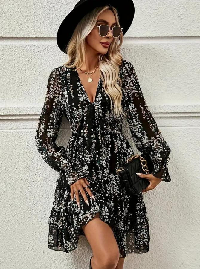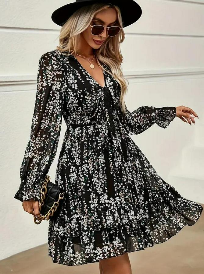 Kadın Uzun Kollu V Yakalı Fırfırlı Ve Bağcıklı şifon Mini Elbise