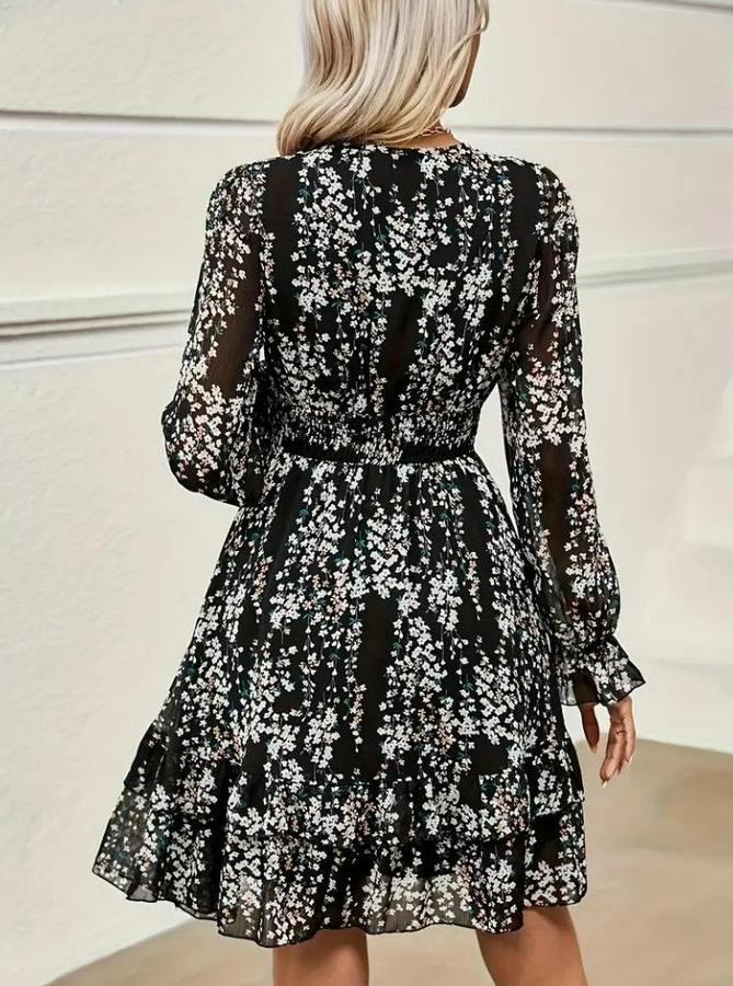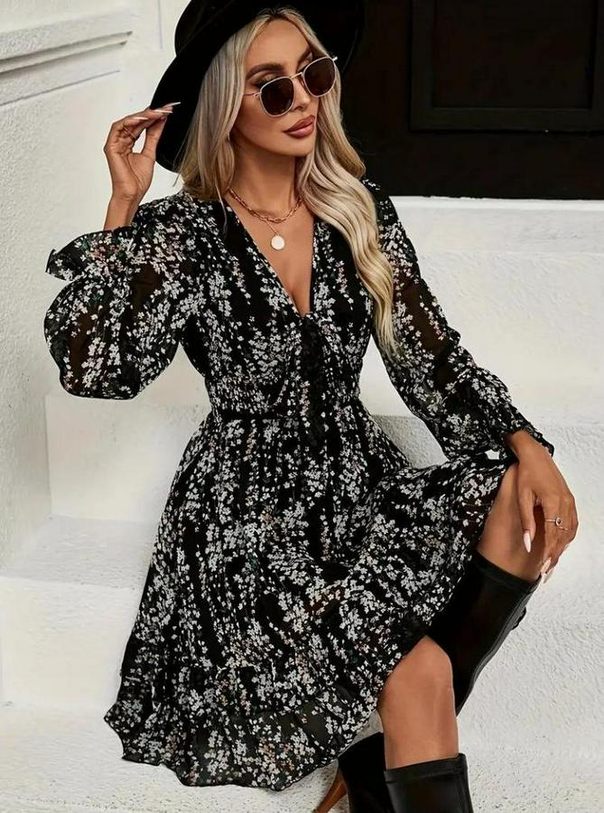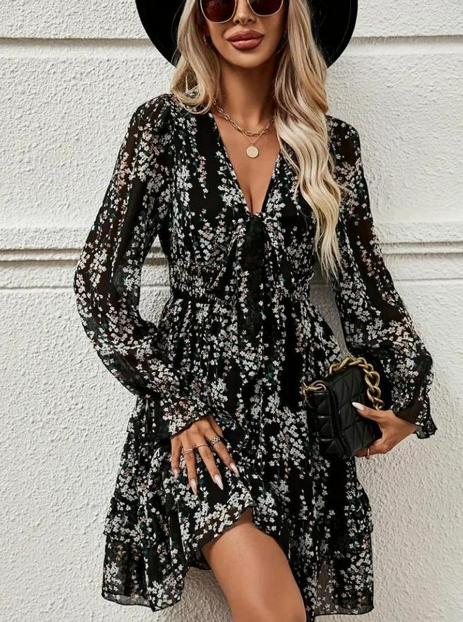 Uzun Kollu V Yakalı Fırfırlı Ve Bağcıklı Şifon Mini Elbise
