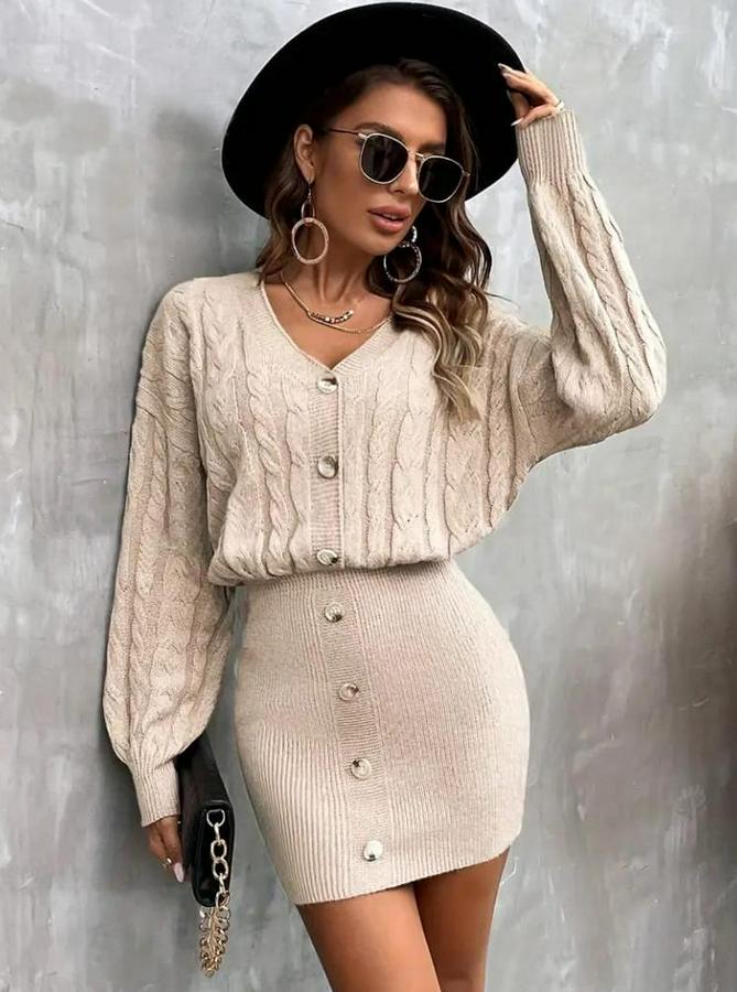 AnasayfaTüm ÜrünlerElbiseUzun Kollu V Yakalı Önden Düğmeli Kısa Triko Elbise