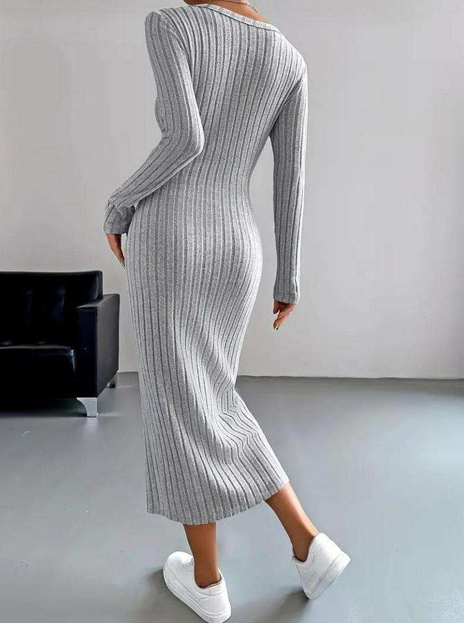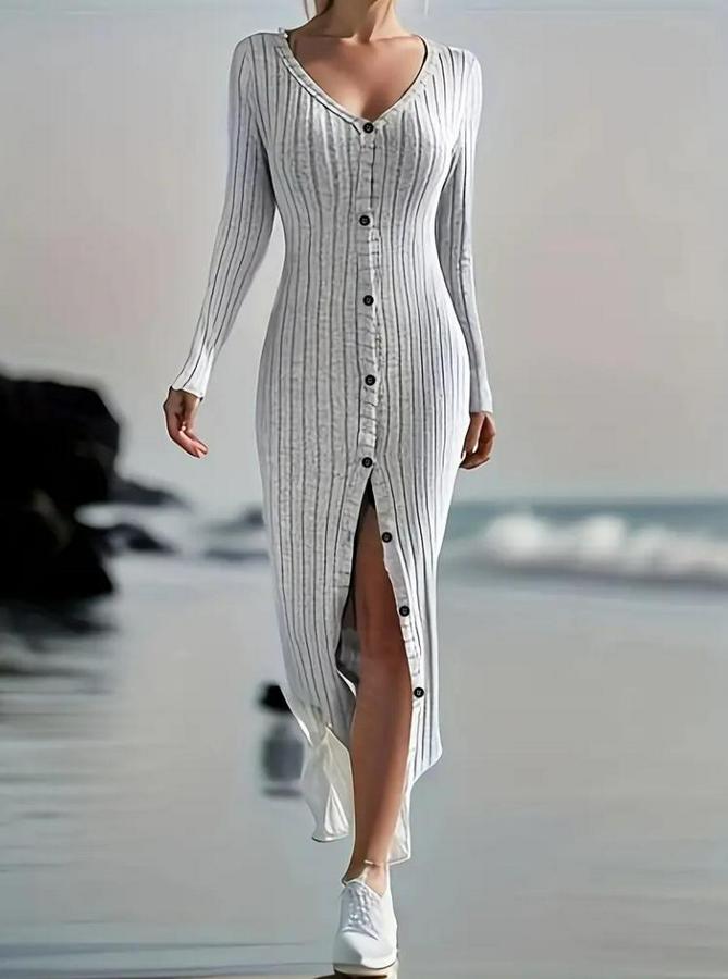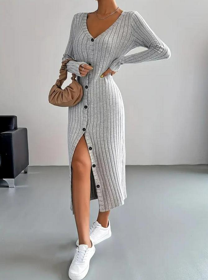 Uzun Kollu V Yakalı Önden Düğmeli Şardonlu Kaşkorse Elbise