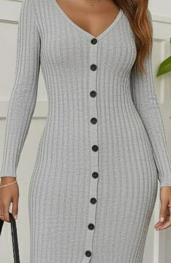 Uzun Kollu V Yakalı Önden Düğmeli Şardonlu Kaşkorse Elbise