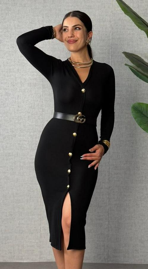 Uzun Kollu V Yakalı Önden Düğmeli Yırtmaçlı Modal Midi Kemersiz Elbise