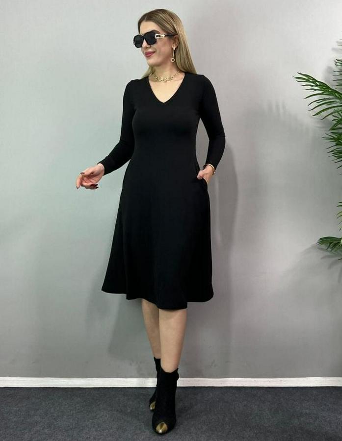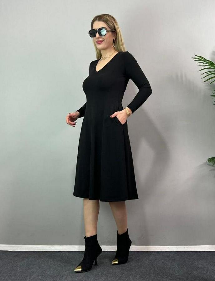 Uzun Kollu V Yakalı Salaş Midi Iki Iplik Elbise