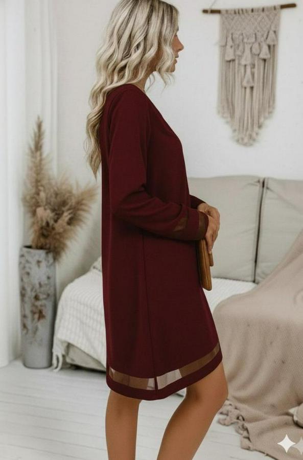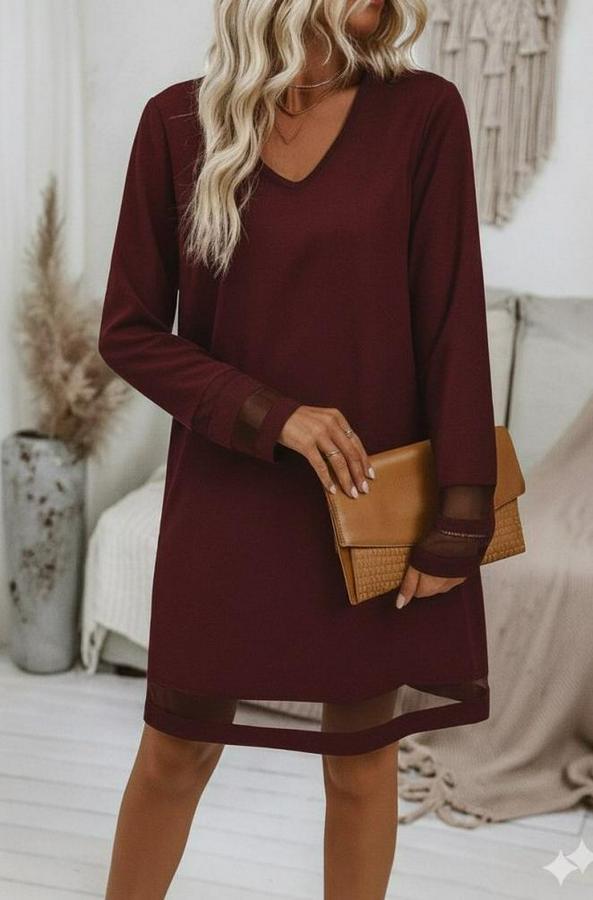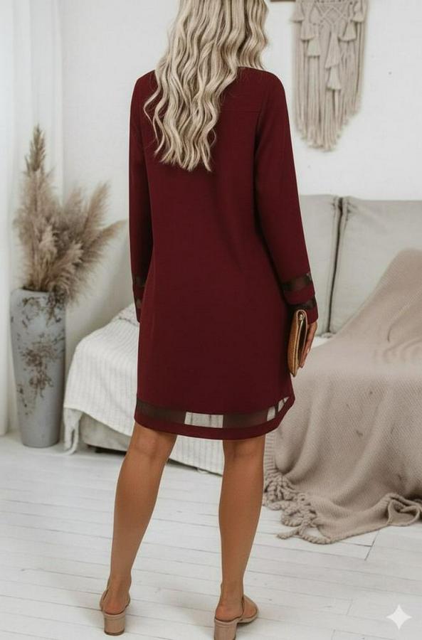 Kadın Uzun Kollu V Yakalı Tül şerit Detaylı Mini Krep Elbise