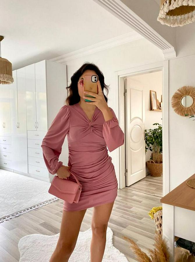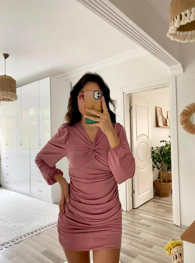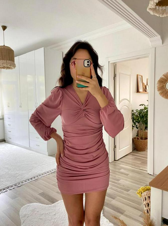 AnasayfaTüm ÜrünlerElbiseUzun Kollu V Yakalı Yanlardan Büzgülü Kısa Sandy Elbise