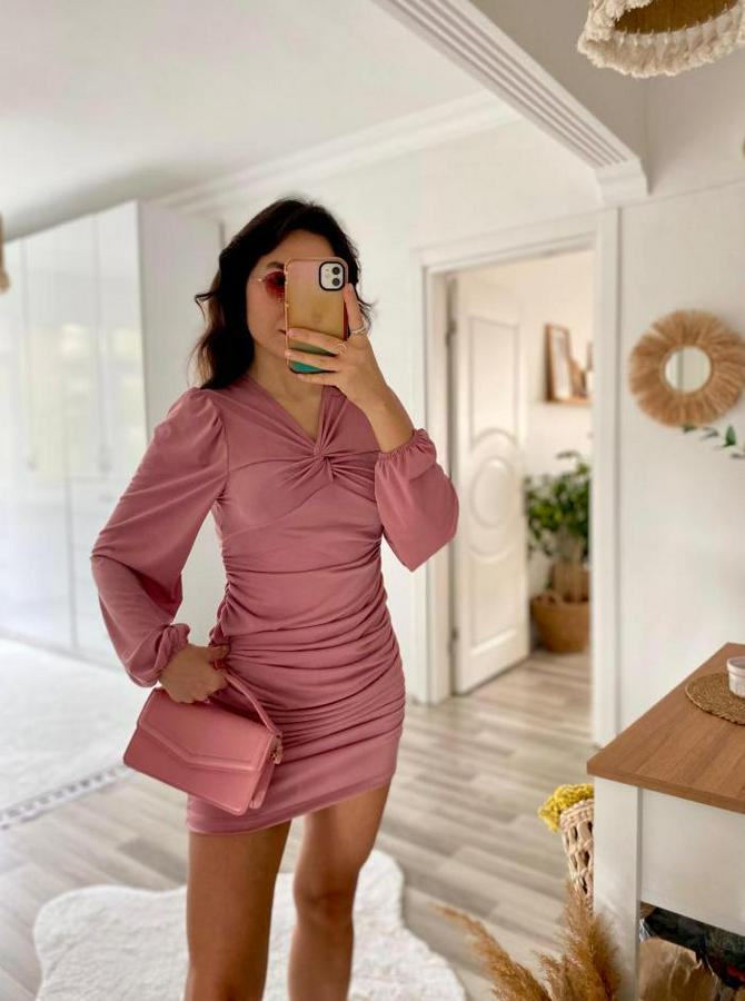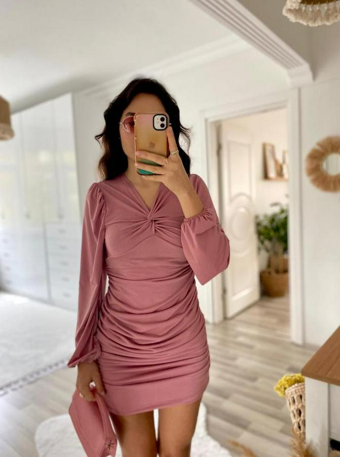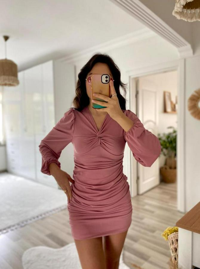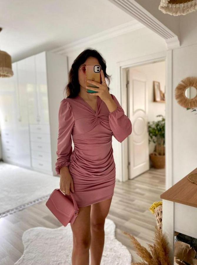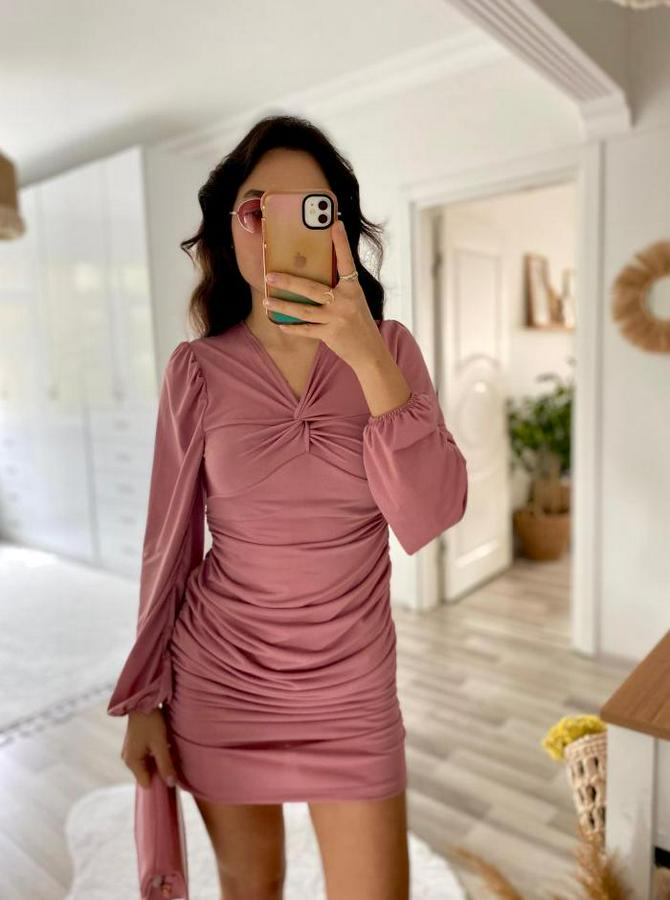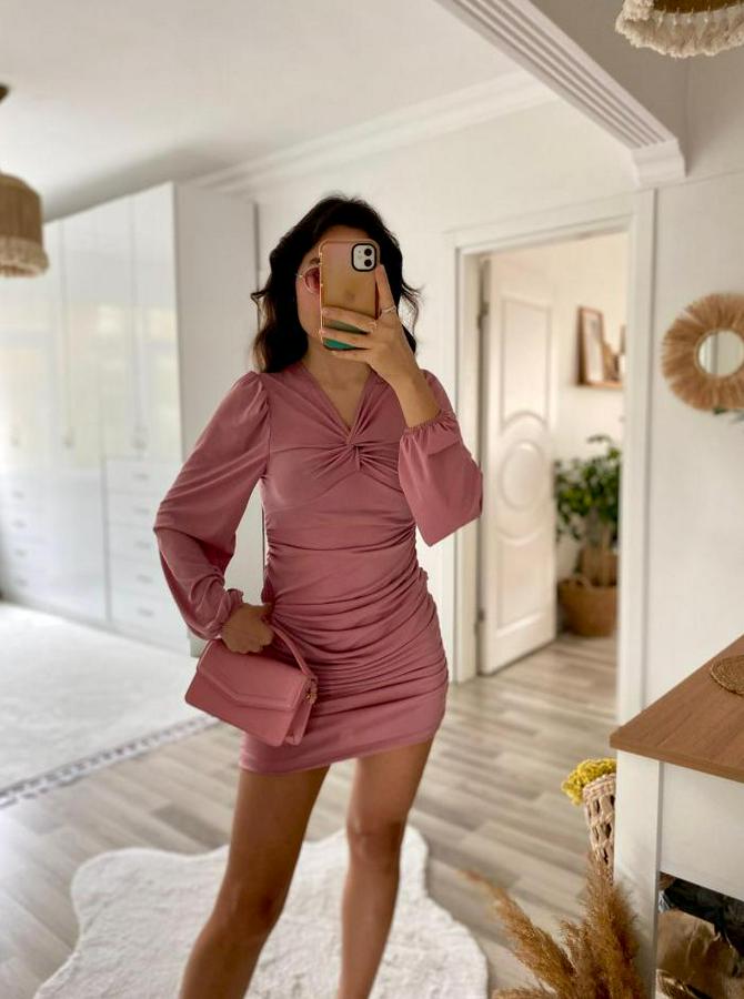 Kadın Uzun Kollu V Yakalı Yanlardan Büzgülü Kısa Sandy Elbise