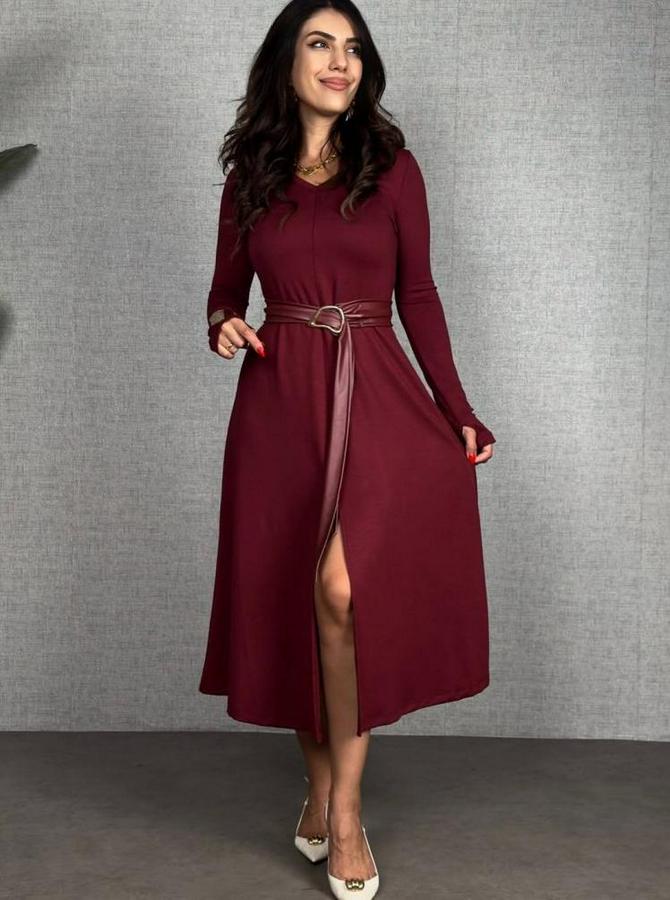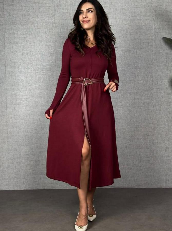 Uzun Kollu Yakalı Belden Deri Detaylı Kuşaklı Yırtmaçlı Midi Viskon Iki Iplik Elbise
