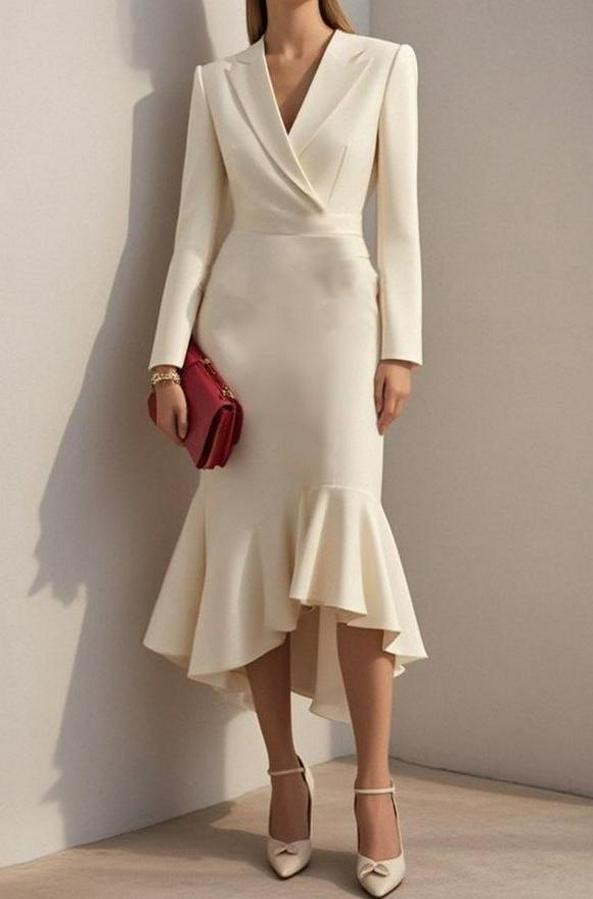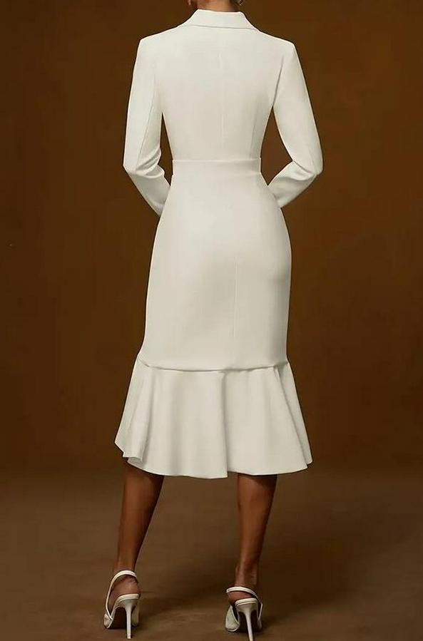 Uzun Kollu Yakalı Belden Oturtmalı Midi Ithal Krep Elbise