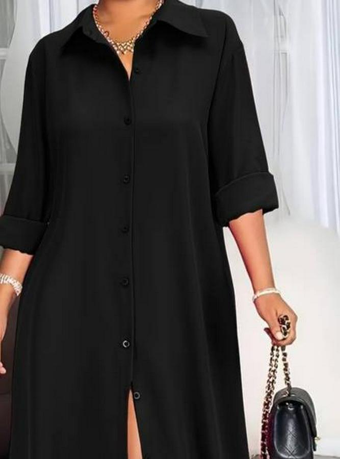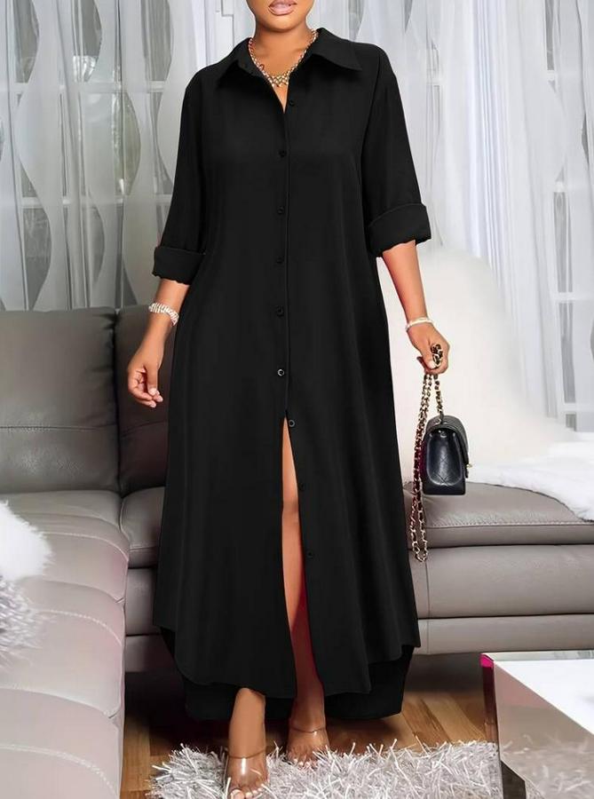 AnasayfaTüm ÜrünlerElbiseUzun Kollu Yakalı Önden Düğmeli Uzun Dokuma Elbise