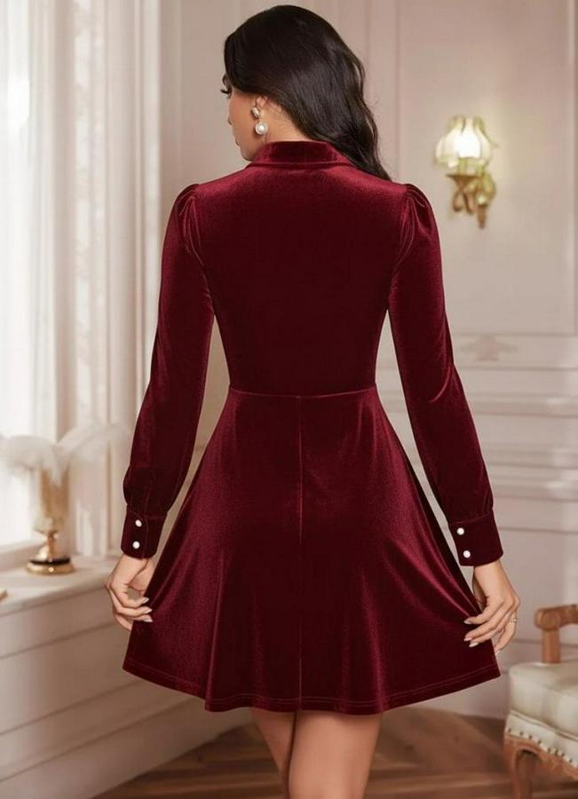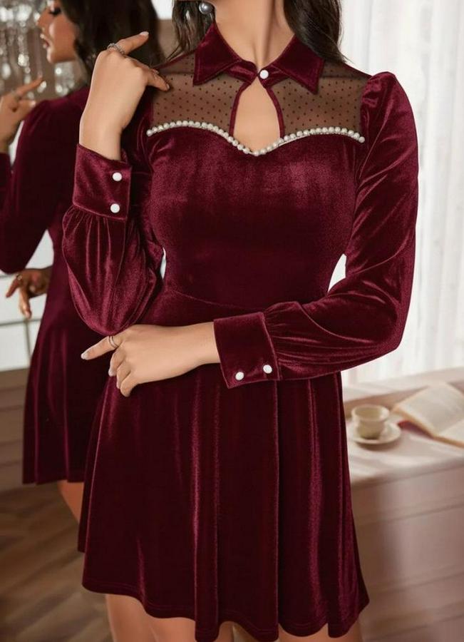 AnasayfaTüm ÜrünlerElbiseUzun Kollu Yakalı Tül Detaylı Incili Mini Kadife Elbise