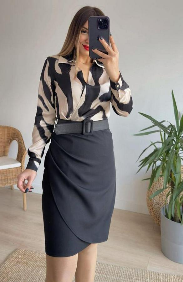 AnasayfaTüm ÜrünlerElbiseUzun Kollu Yakalı Üst Dalgıç Eteği Krep Kemerli Elbise