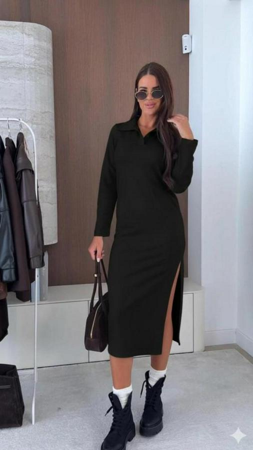 Kadın Uzun Kollu Yakalı Yandan Yırtmaçlı Midi Modal Elbise