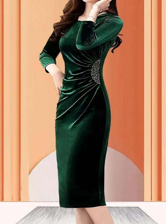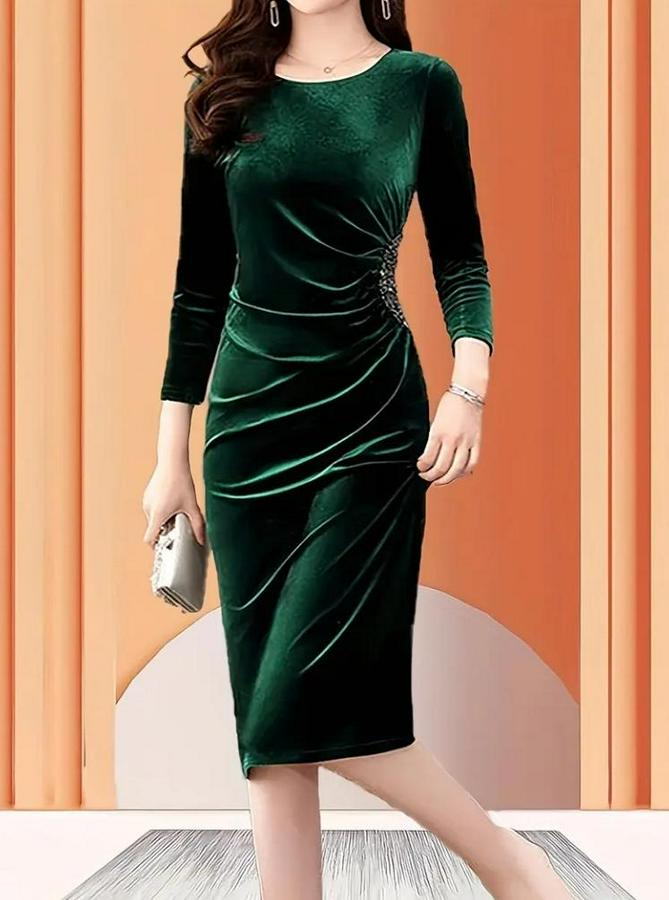 Kadın Uzun Kollu Yakası Açık Yanlardan Büzgülü Taş Detaylı Midi Kadife Elbise