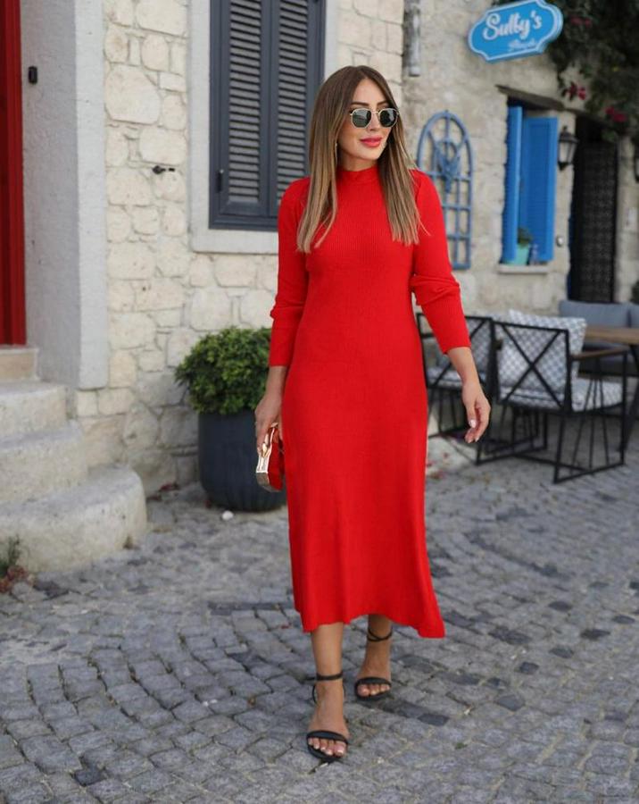 Uzun Kollu Yarı Balıkçı Yaka Arkadan Pencere Detaylı Bağcıklı Midi Triko Elbise