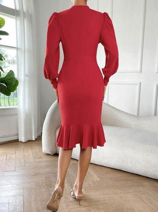 Uzun Kollu Yarı Balıkçı Yaka Etek Ucu Fırfır Detaylı Midi Ithal Krep Elbise