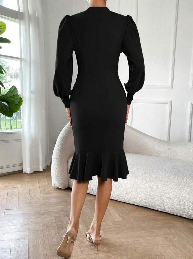 Uzun Kollu Yarı Balıkçı Yaka Etek Ucu Fırfır Detaylı Midi Ithal Krep Elbise