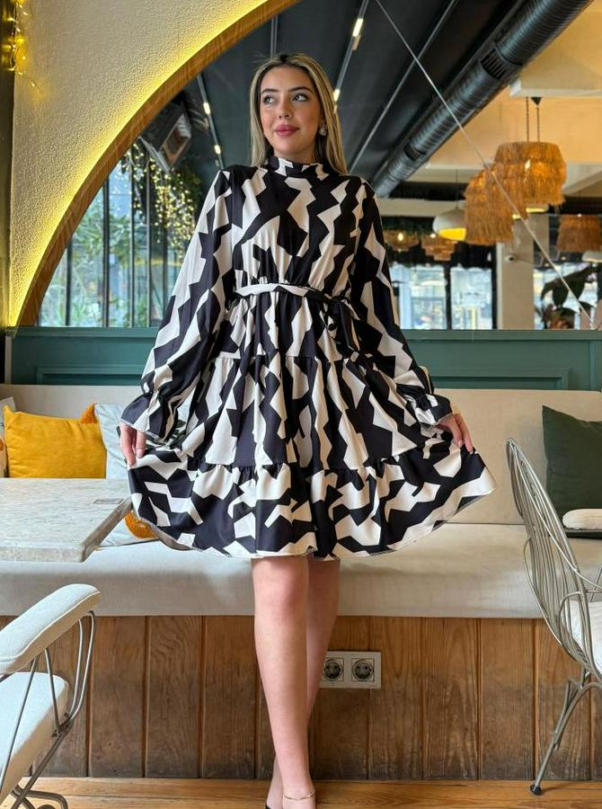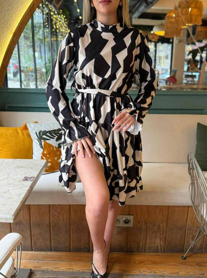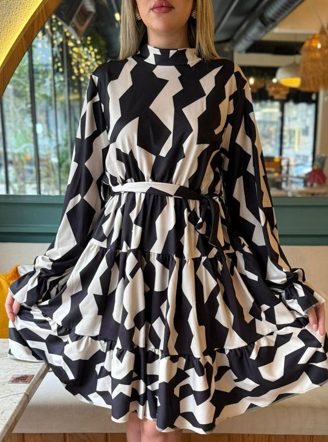 Kadın Uzun Kollu Yarı Balıkçı Yaka Geometrik Desen Kısa şardonlu Dalgıç Elbise